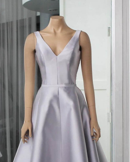 Silver V-neck Satin Midi Dress