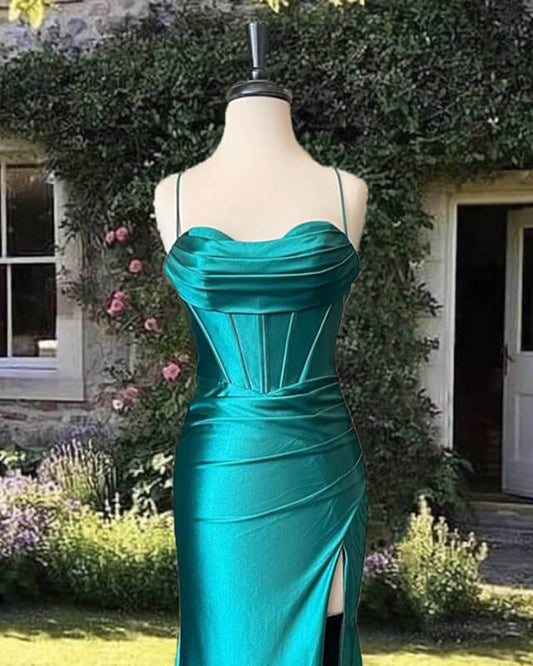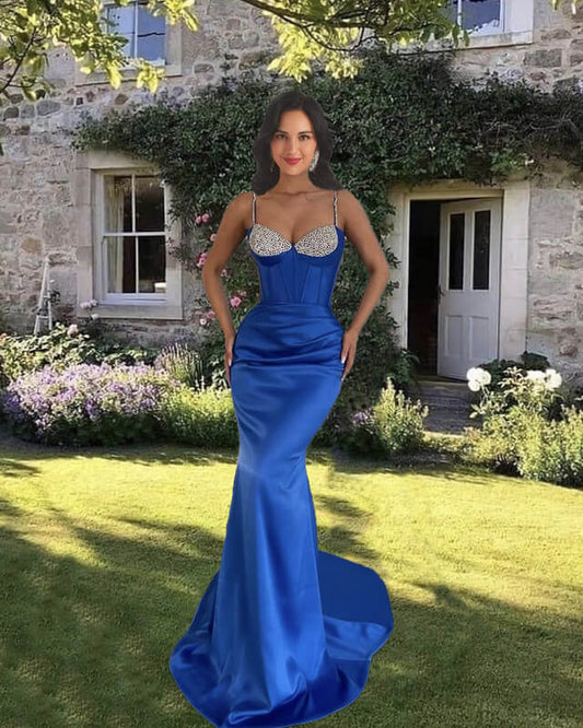 Mermaid Beaded Spaghetti Straps Satin V-neck Dress