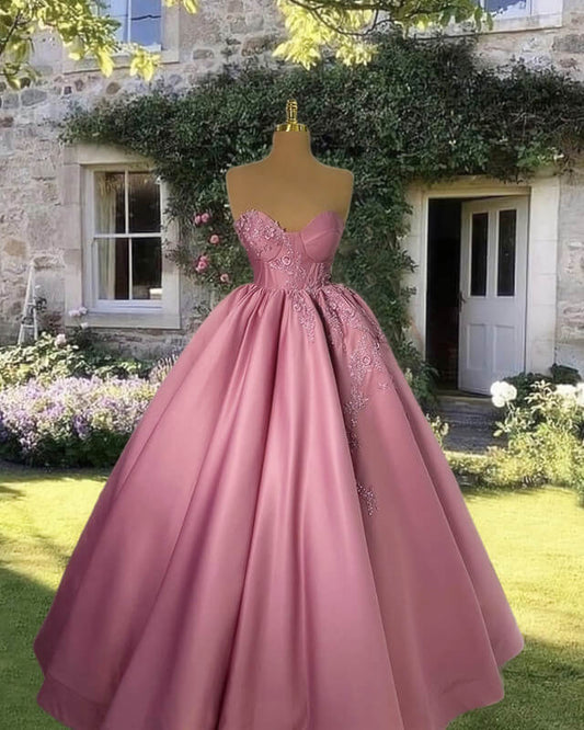 Strapless Ball Gown Satin Dress With 3D Flowers.