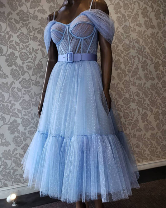 Blue Dot Tulle Off-the-shoulder Corset Dress