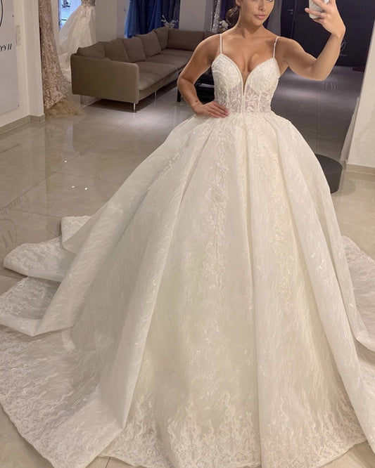 Ball Gown V Neck Lace Dresses Wedding Spaghetti Straps