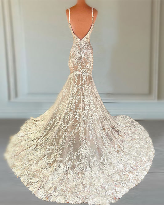 Ivory Lace Mermaid Wedding Dresses Nude Tulle Open Back