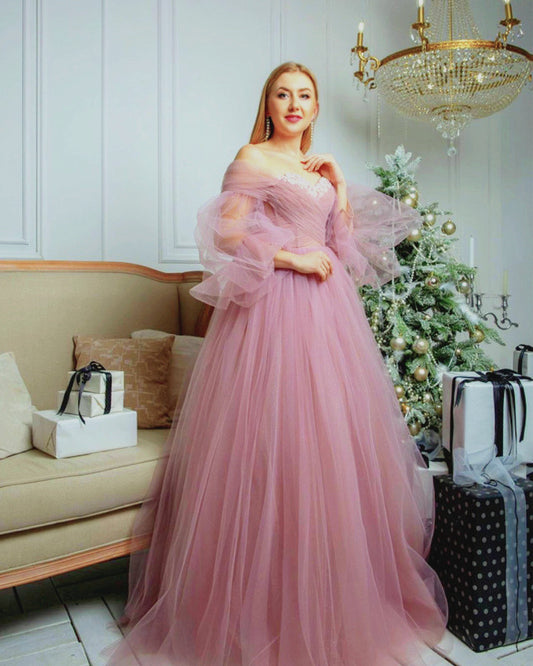 Dusty Pink Boho Wedding Dresses Tulle Long Sleeves Off The Shoulder
