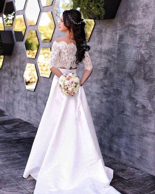 Boho Satin Wedding Dress Two Piece Lace Half Sleeves