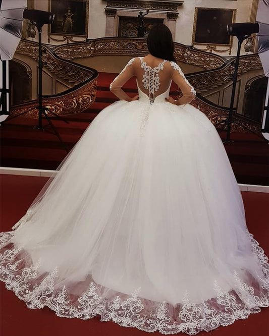 Elegant Lace Long Sleeves Beaded Corset Wedding Dress Ball Gown
