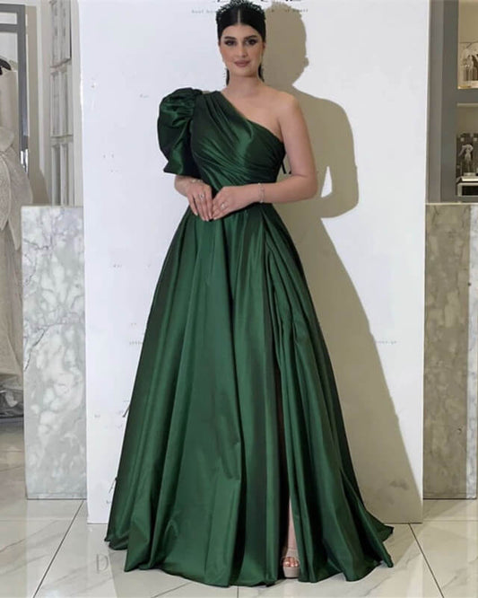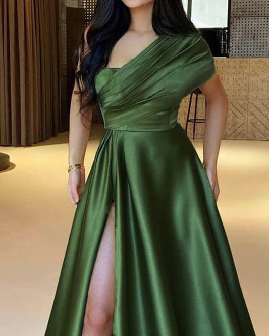Olive Green Satin One Shoulder Slit Dress