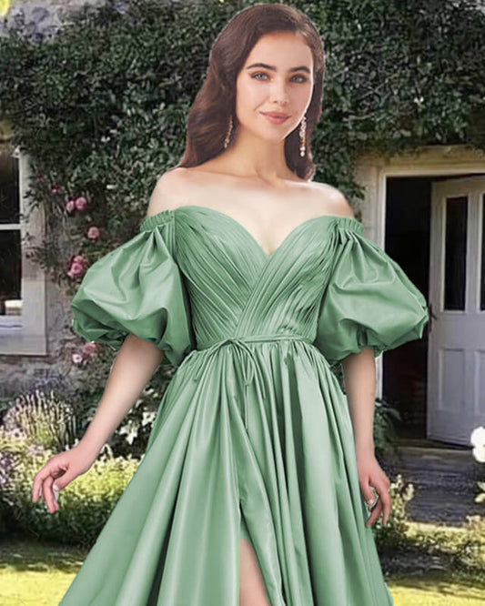 Sage Satin A-line Puffy Sleeve Dress