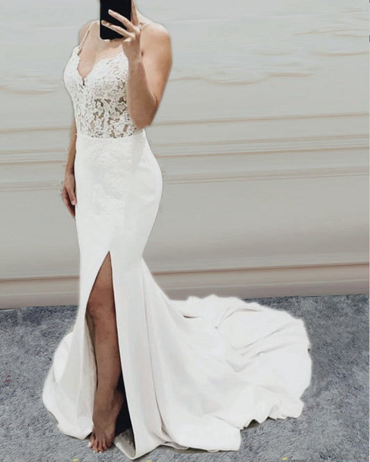 Sexy V Neck Mermaid Wedding Dress Leg Slit