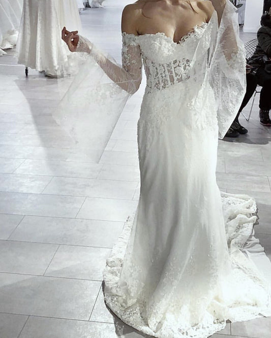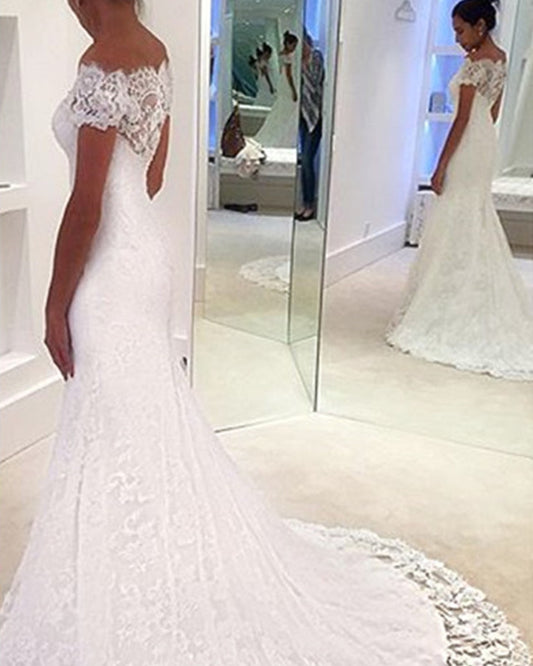 Puffy Sleeeves Mermaid Wedding Dress Lace Off Shoulder