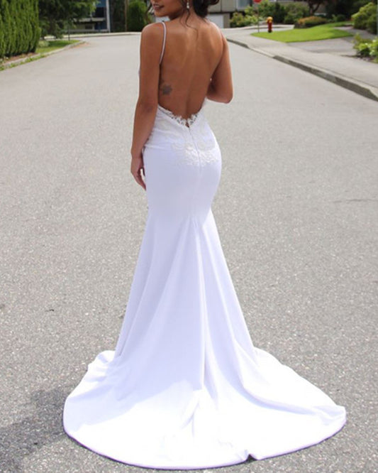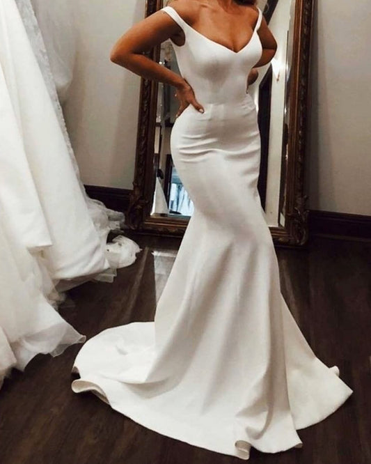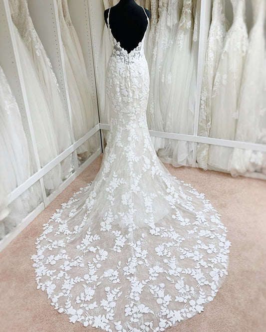 Chapel Train Mermaid Wedding Dress Satin Spaghetti Straps