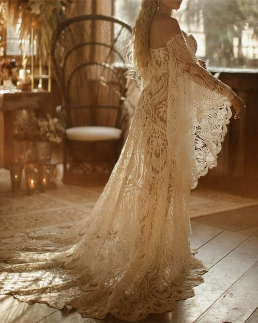 Vintage Boho Lace Wedding Dress Puffy Sleeves