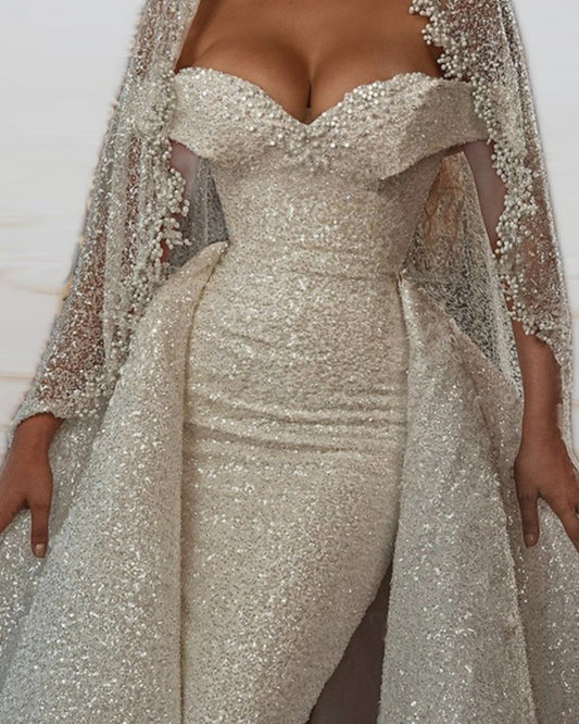 Mermaid Sequins Wedding Dress Off The Shoulder Removable Train