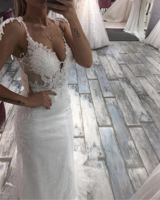 Mermaid Wedding Dress Square Sequins Tulle Lace V Neck