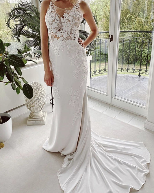 Lace Embroidery Mermaid Wedding Dress Sweep Train