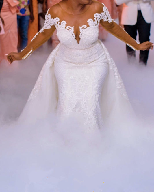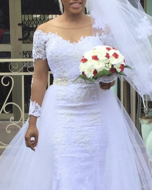 Long Sleeves Lace Mermaid Wedding Dress Detachable Skirt