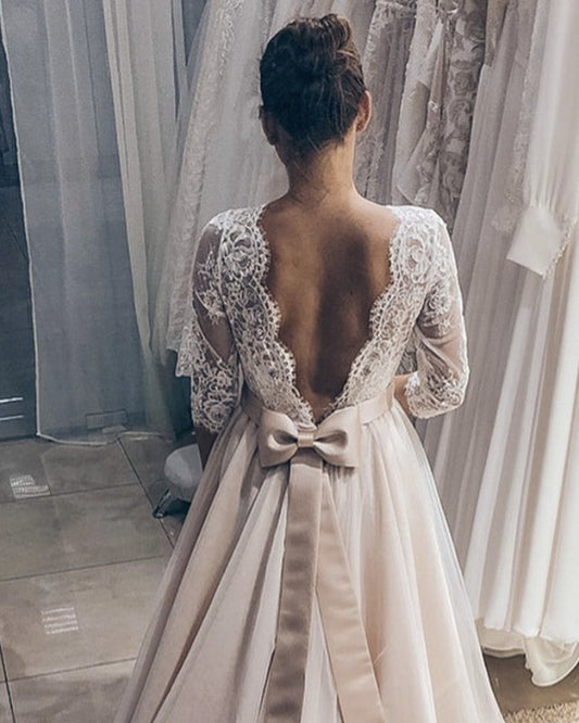 Modest Lace 3/4 Sleeves Wedding Dress Bow Back