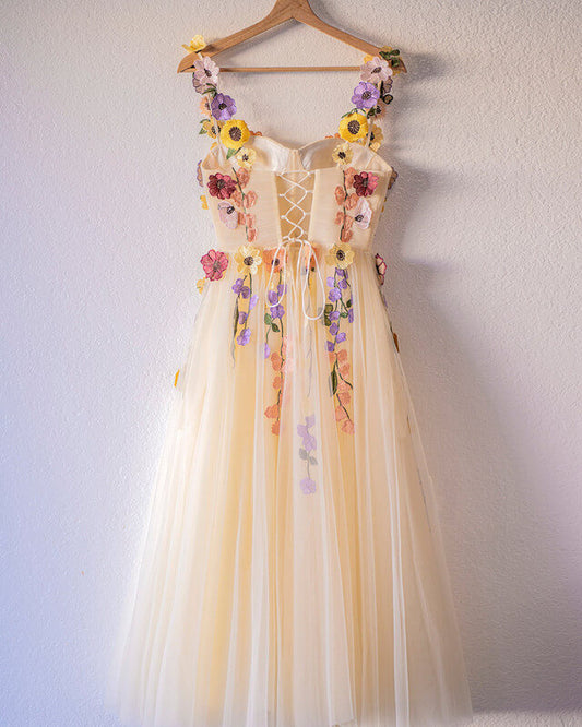 Champagne A-line Tea Length Corset Dress With 3D Flowers