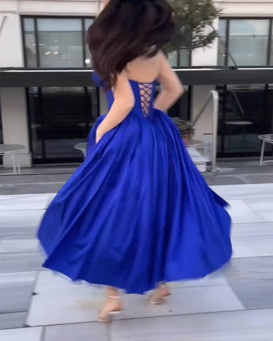 Royal Blue Strapless Corset Satin Midi Ball Gown