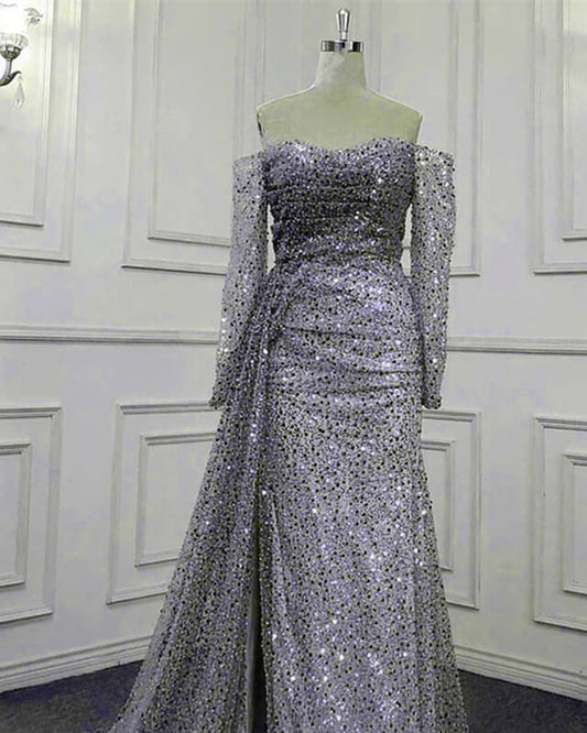 Mermaid Silver Sequin Beaded Off Shoulder Dress