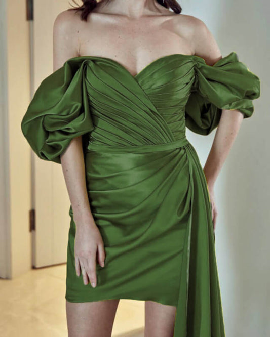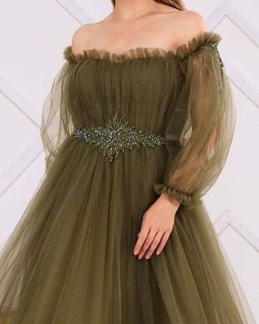 Olive Green Tulle Long Sleeve Off-Shoulder Dress