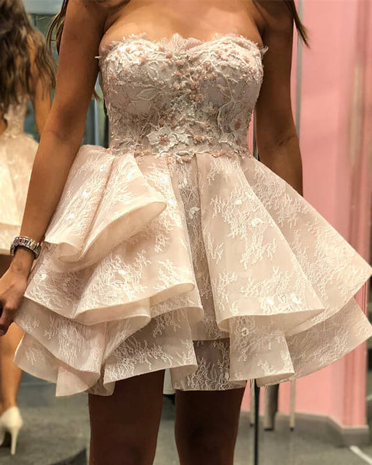 Cream Floral Lace Sweetheart Ruffles Homecoming Dress