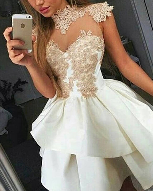White Satin Ruffles Homecoming Dress With Cream Lace