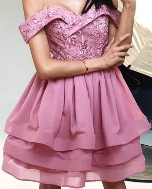 Mauve Off The Shoulder Lace Appliques Homecoming Dress