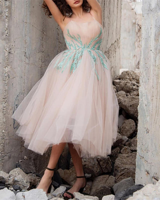 Nude Tulle Sweetheart Embroidery Tea Length Ball Gown