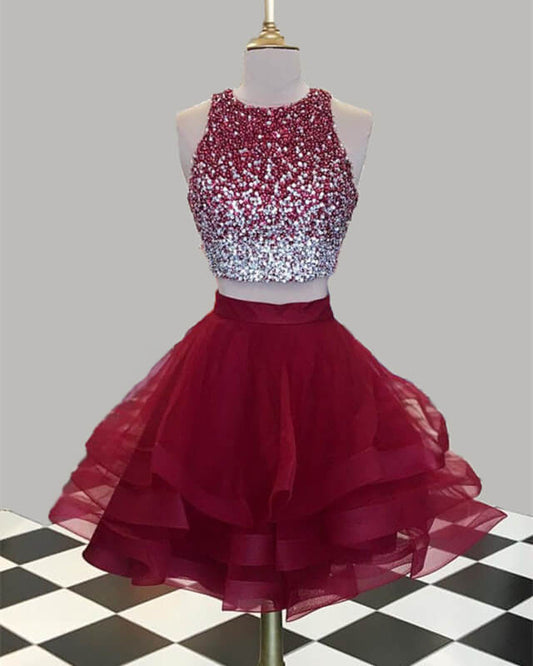 Short Green Two Piece Homecoming Dresses Beaded Ruffles