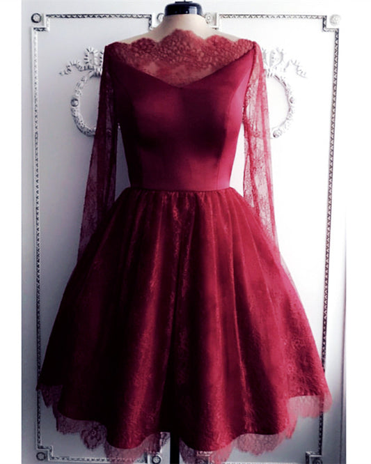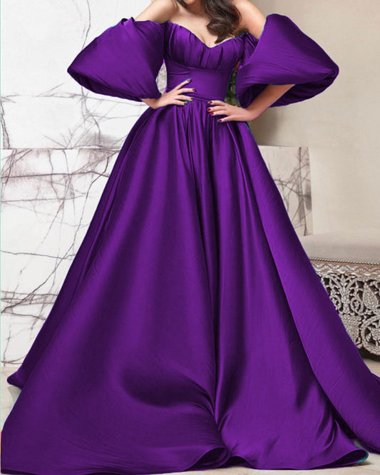 Burgundy Puffy Sleeves Prom Dresses Satin