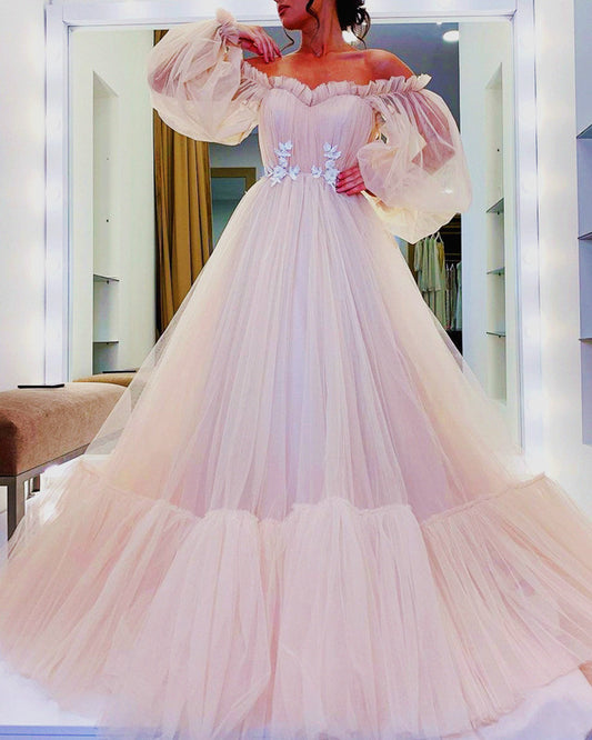 Tulle Princess Prom Dresses Puffy Sleeves Ruffles