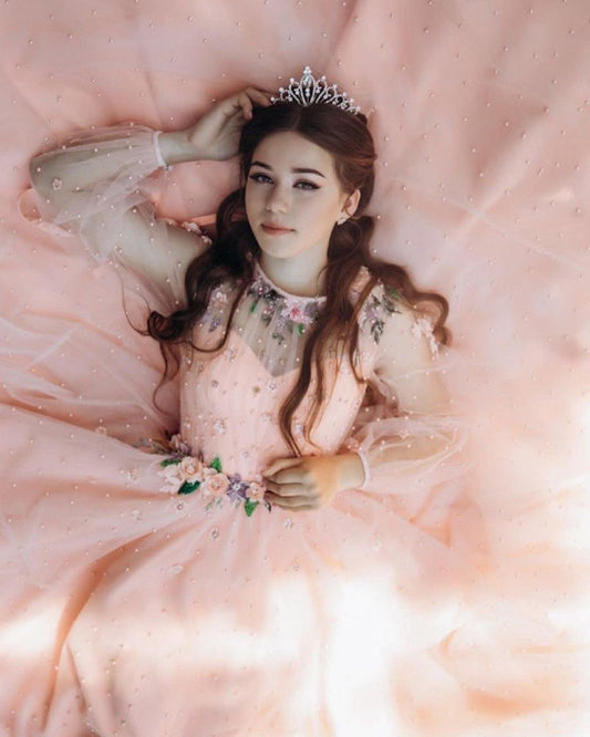 Peach Prom Dresses Tulle Ball Gown Long Sleeves with 3D Flowers
