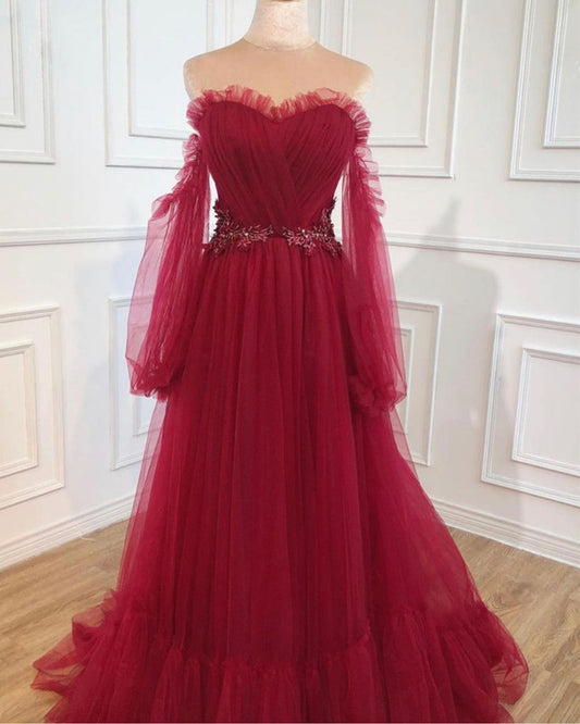 Tulle Princess Prom Dresses Ruffles Sweetheart Puffy Sleeves