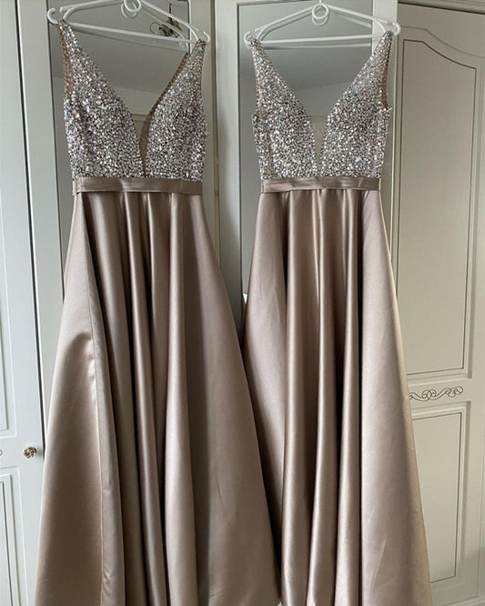 Plunge Neck Beaded Satin Dresses