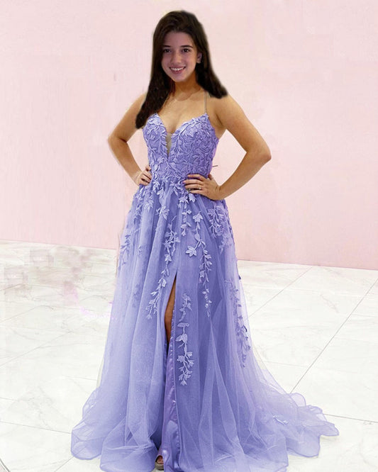 Elegant Tulle Appliques Split Prom Dresses
