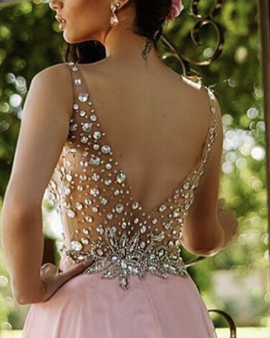 Beaded V Neck Split Chiffon Prom Dresses Open Back