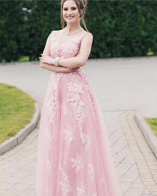 Elegant A-line V Neck Tulle Long Dresses Lace Appliques