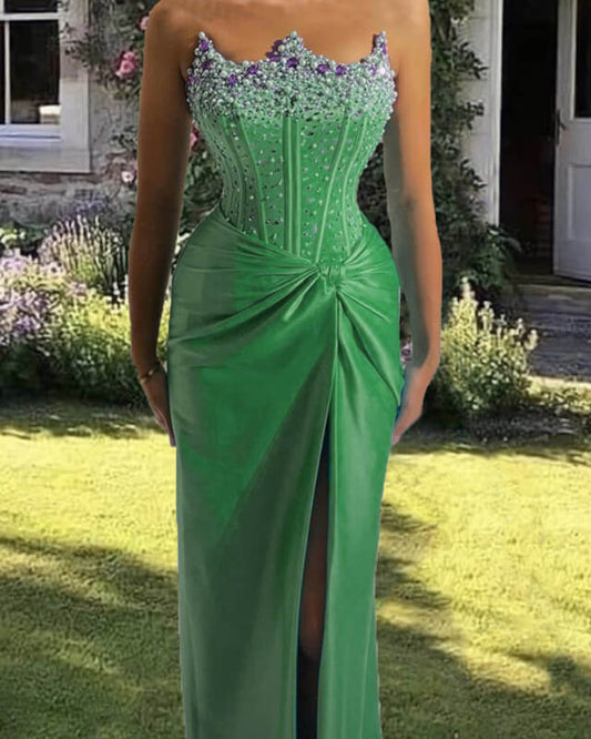 Mermaid Beaded Strapless High Slit Satin Dress