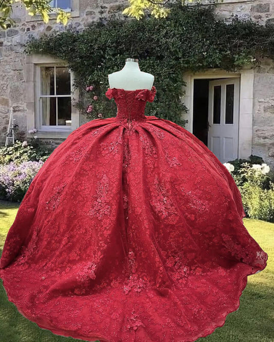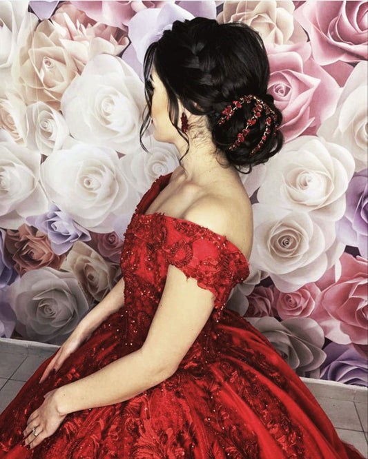 Red Lace Embrodiery Ball Gown Off Shoulder Dress