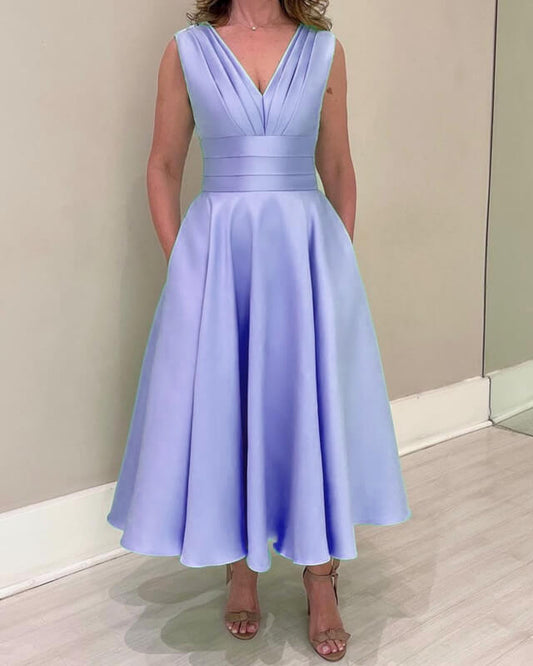 Tea Length Satin V-neck Party Dresses With Pockets