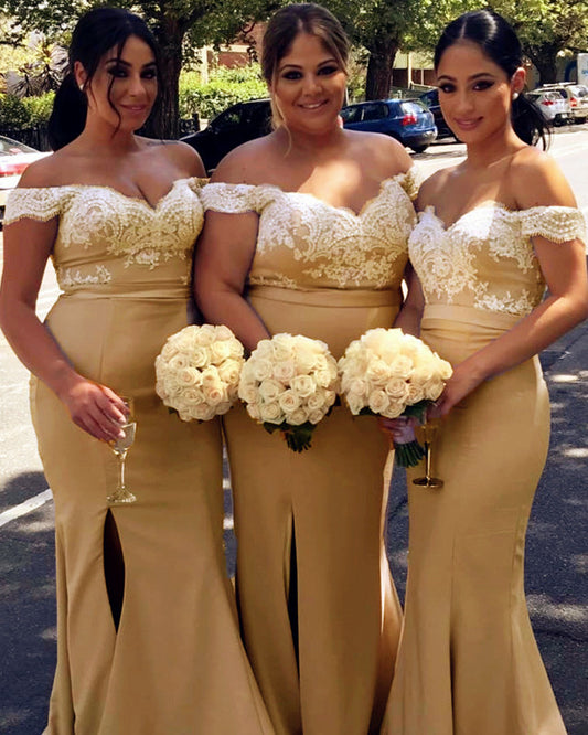 Ivory Lace Mermaid Split Bridesmaid Dresses Satin Off Shoulder