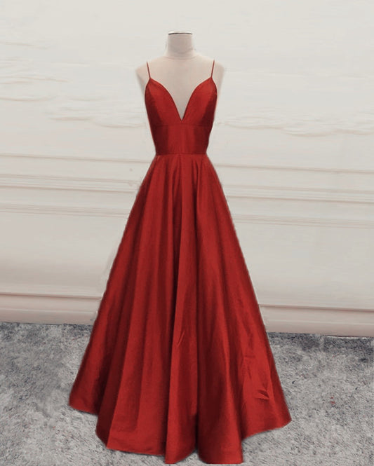 Simple Satin Prom Long Dresses Spaghetti Straps Plunge Neck