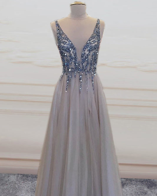 Tulle V Neck Prom Long Dresses Sequins Beaded Leg Split