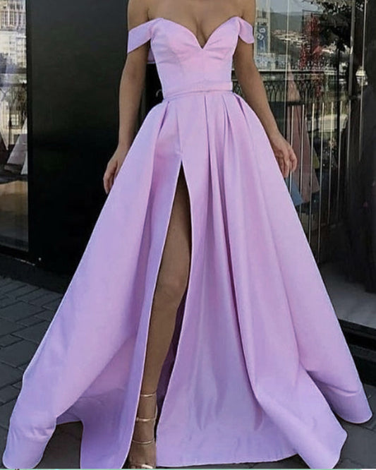Simple Satin Prom Long Dresses Side Split Off The Shoulder