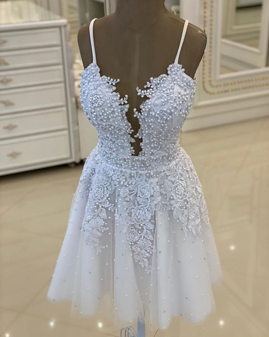 White Lace Beaded Homecoming Dresses With Straps
