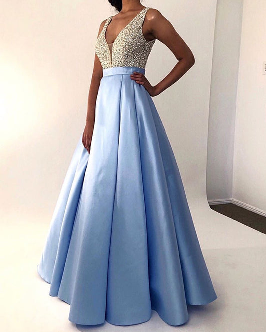 Ball Gown V Neck Satin Prom Dresses Beaded