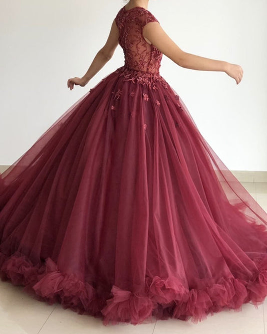 Ball Gown Ruffles Prom Dreses Sheer Lace Embroidery Top