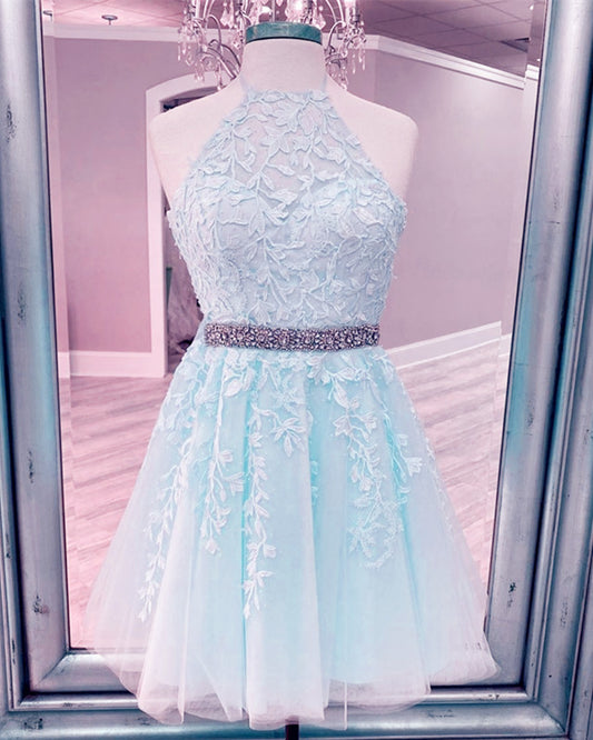 Halter Homecoming Dresses Lace Embroidery Beaded Sashes