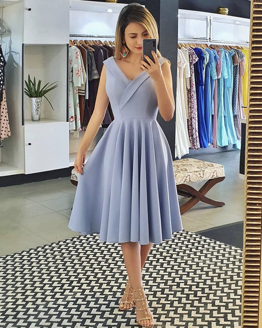 Tea Length Bridesmaid Dress Satin V Neck Off Shoulder