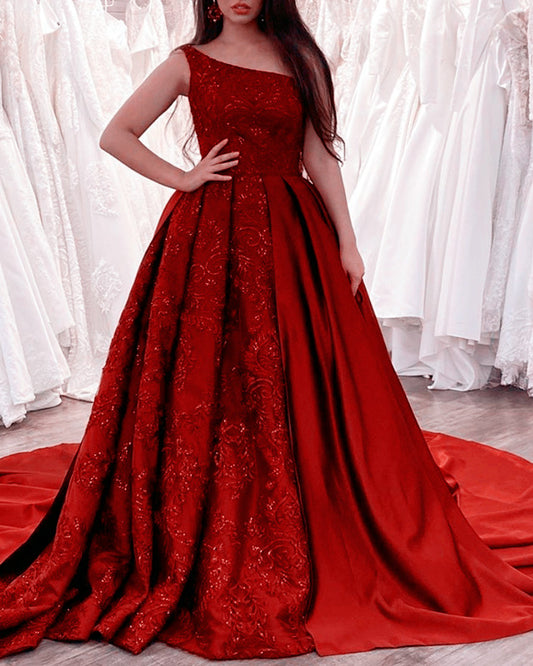 One Shoulder Prom Satin Dresses Lace Embroidery Elegant